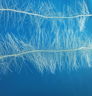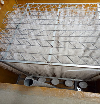 彈性填料篩選用聚烯烴類和聚酰胺中的幾種耐腐、耐溫、耐老化的品種,混合以親水、吸附、抗熱氧等助劑,采用特殊的拉絲、絲條制毛工藝,將絲條穿插同著在耐腐、高強度的中心繩上。由于選材和工藝配方精良,剛?cè)徇m度,使絲條呈立體均勻排列輻射狀態(tài),制成了懸掛式立體彈性填料的單體.填料在有效區(qū)域內(nèi)能立體全方位均勻舒展?jié)M布,使氣、水、生物膜得到充分混滲接觸交換,生物膜不僅能均勻地著床在每一根絲條上,保持良好的活性和空隙可變性,而且能在運行過程中獲得大的比表面積。